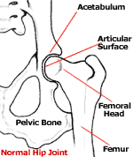 To understand what hip dysplasia really is we must have a basic understanding of the joint that is being affected. The hip joint forms the attachment of the hind leg to the body and is a ball and socket joint. The ball portion is the head of the femur while the socket (acetabulum) is located on the pelvis. In a normal joint the ball rotates freely within the socket. To facilitate movement the bones are shaped to perfectly match each other, with the socket surrounding the ball. To strengthen the joint, the two bones are held together by a ligament. The ligament attaches the femoral head directly to the acetabulum. Also, the joint capsule, which is a very strong band of connective tissue, encircles the two bones adding further stability. The area where the bones actually touch each other is called the articular surface. It is perfectly smooth and cushioned with a layer of spongy cartilage. In the normal dog, all of these factors work together to cause the joint to function smoothly and with stability.